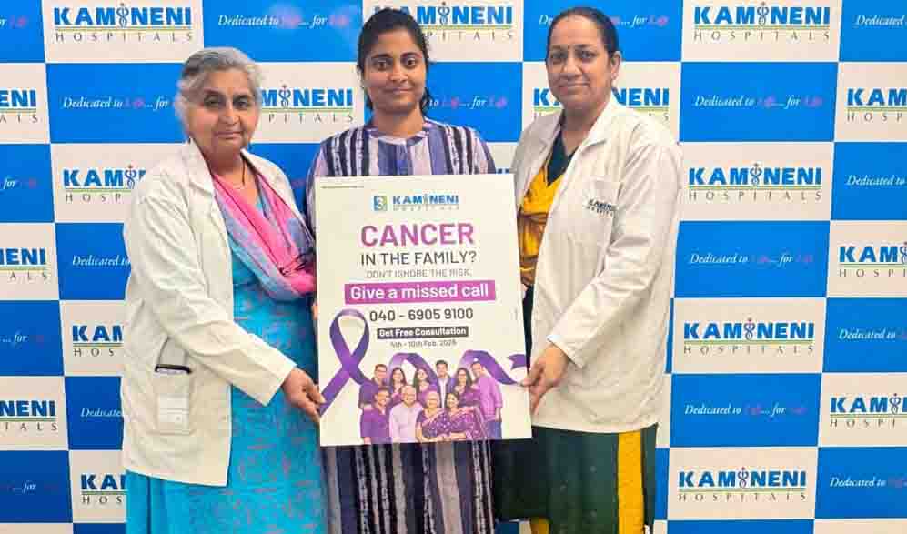 On the occasion of World Cancer Day, Kamineni Hospitals launched an awareness campaign on Tuesday to help people assess their cancer risk based on family history. As part of the initiative, individuals can give a missed call to 040-6905 9100 between February 4 and 10, 2026, to avail a free expert consultation with specialists. The campaign targets people with one or more relatives diagnosed with cancer, as nearly 10% of cancers are linked to inherited genetic changes. Doctors highlighted that cancers such as breast, ovarian, endometrial, prostate, and colorectal—especially when seen at a young age or across multiple family members—warrant genetic evaluation.