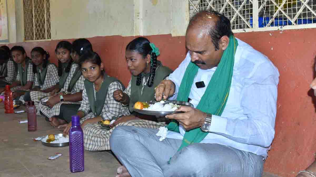 During the visit, Parthasarathi dined with students to personally assess the taste and quality of the mid-day meal. He interacted with both boys and girls, asking about their academic experience, teaching standards, and satisfaction with the meals.
