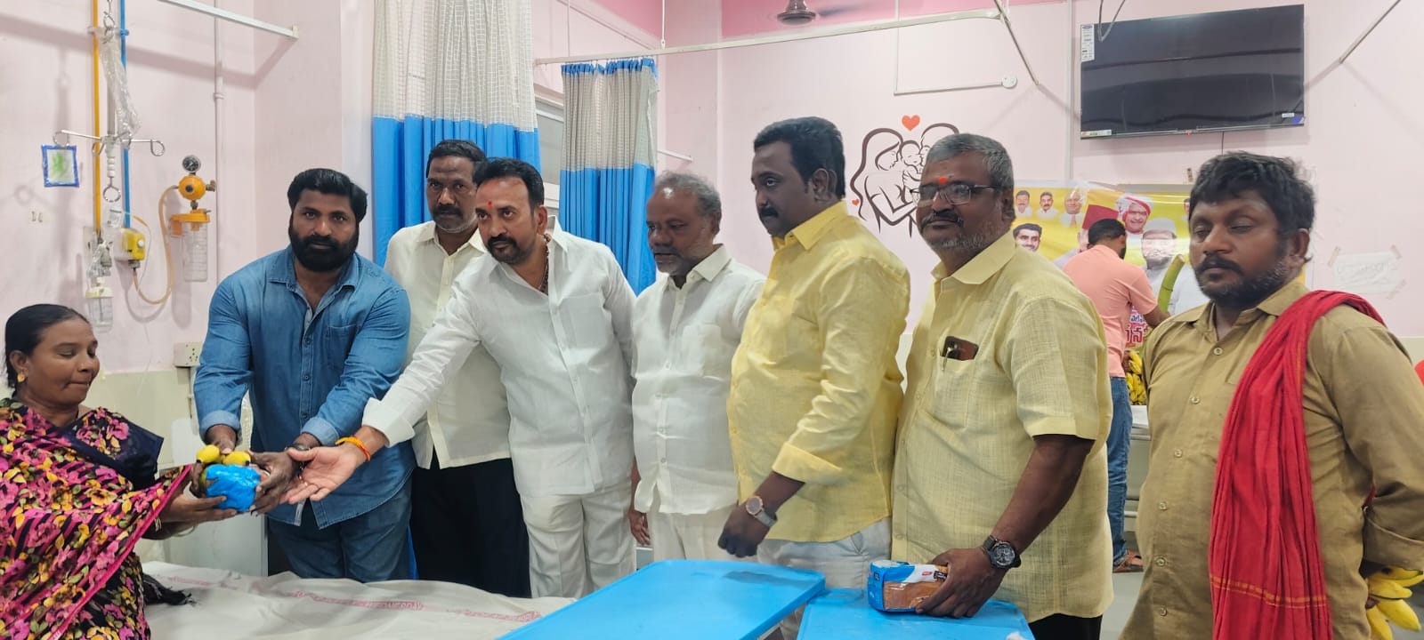 TDP leaders distribute fruits to new mothers at GGH, Guntur, as part of Mohammed Naseer birthday celebrations.